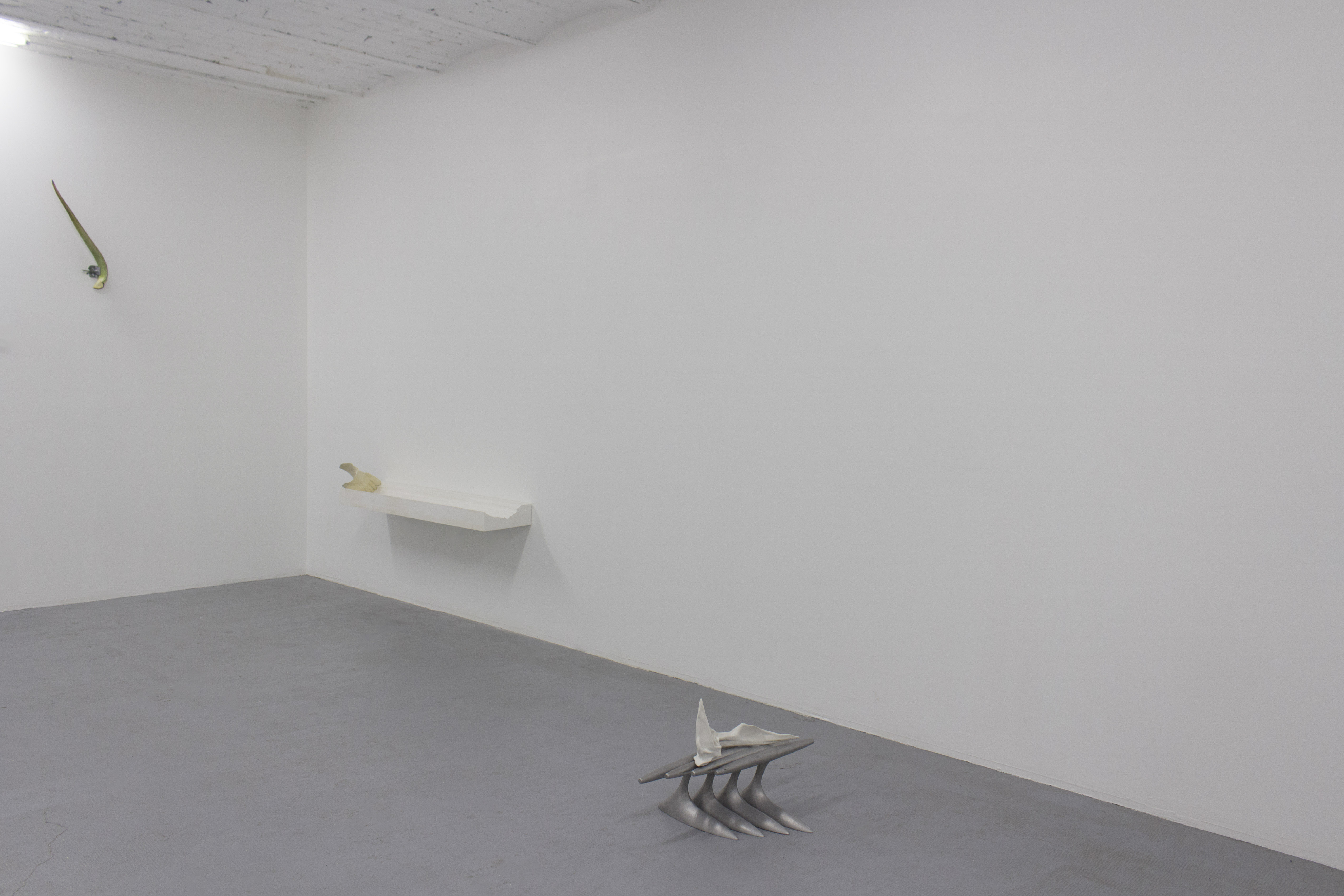 Cette collaboration est aussi prétexte à essayer, un chantier à ciel fermé qui prend place dans le sous-sol de la galerie Chapelle XIV. Ici, pas de poussière de plâtre mais la délicatesse d’un agrume bicolore pourrissant, des pieds et des moulures affamées ou encore un amadouvier polypore aux allures de fossile greffé aux pages de livres, des interstices de martyrs comblés et des formes contrariées simulant des coïncidences maîtrisées. L’ensemble constitue les strates et empreintes d’un monde artificiel pensé pour l’occasion comme un long poème, une ode aux courbures de la nature qu’elles s’amusent à recréer et à ces petits détails qui échappent à notre perception.