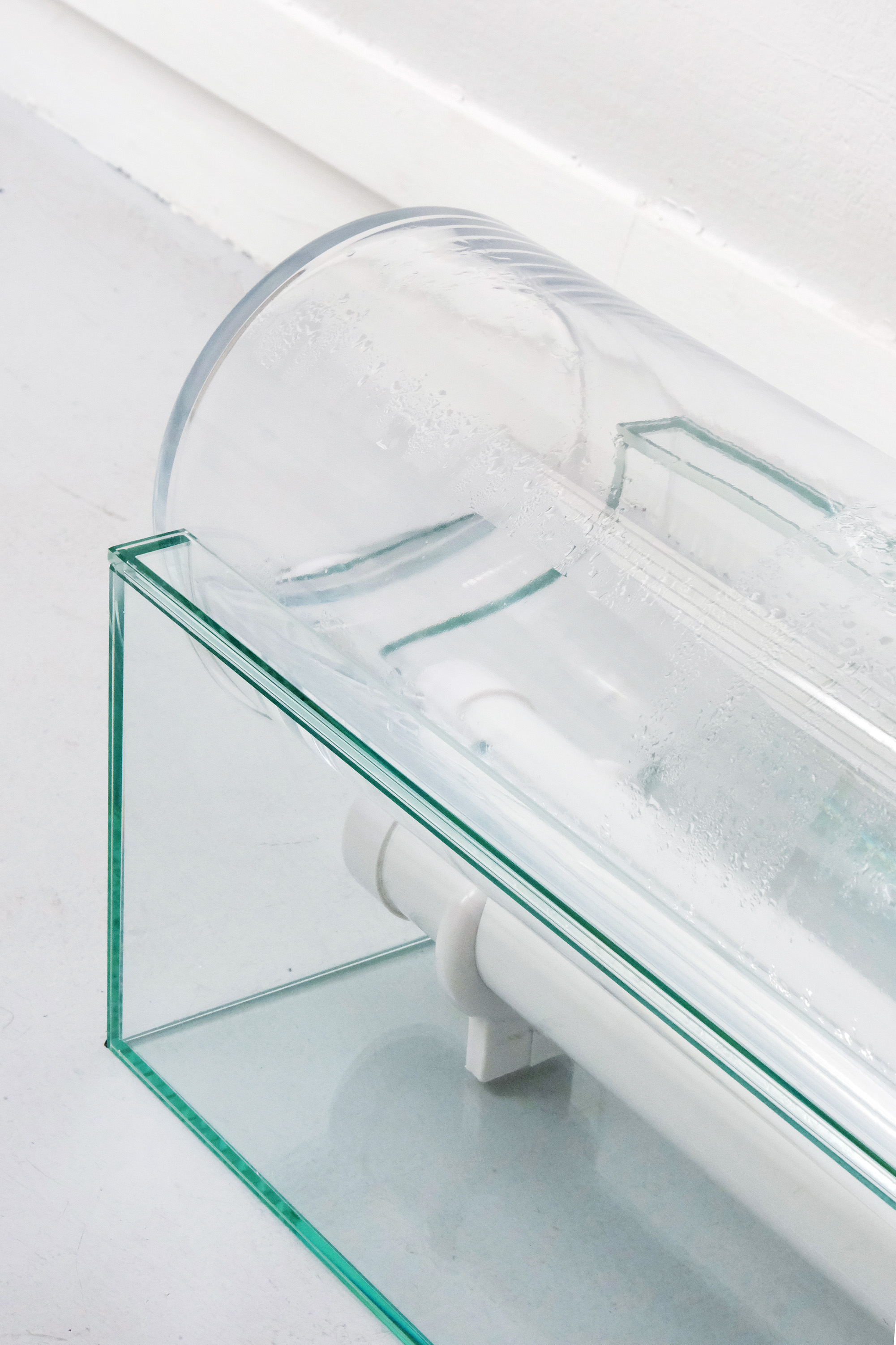 Lemons in the glass box dehydrate, releasing heat as they decompose. The water from the lemons evaporates, condenses on the glass walls and runs down the sloping roof to be collected in a glass of water.