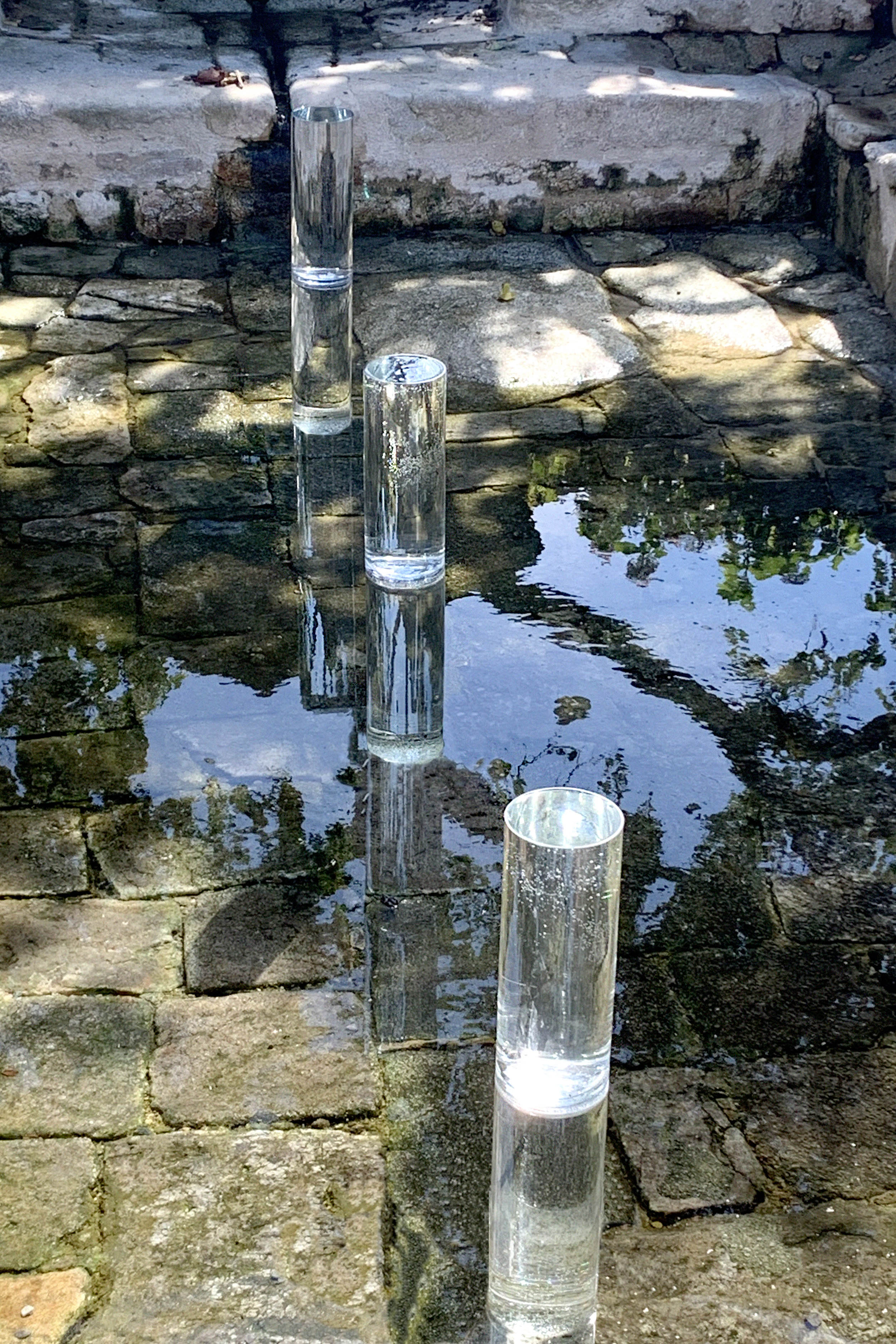 Un vase rempli d’eau est retourné vers le fond du lavoir, un autre vase est posé à l’endroit sur celui-ci formant une colonne. Les colonnes d’eau révèlent les variations du temps et des mouvements alentours.